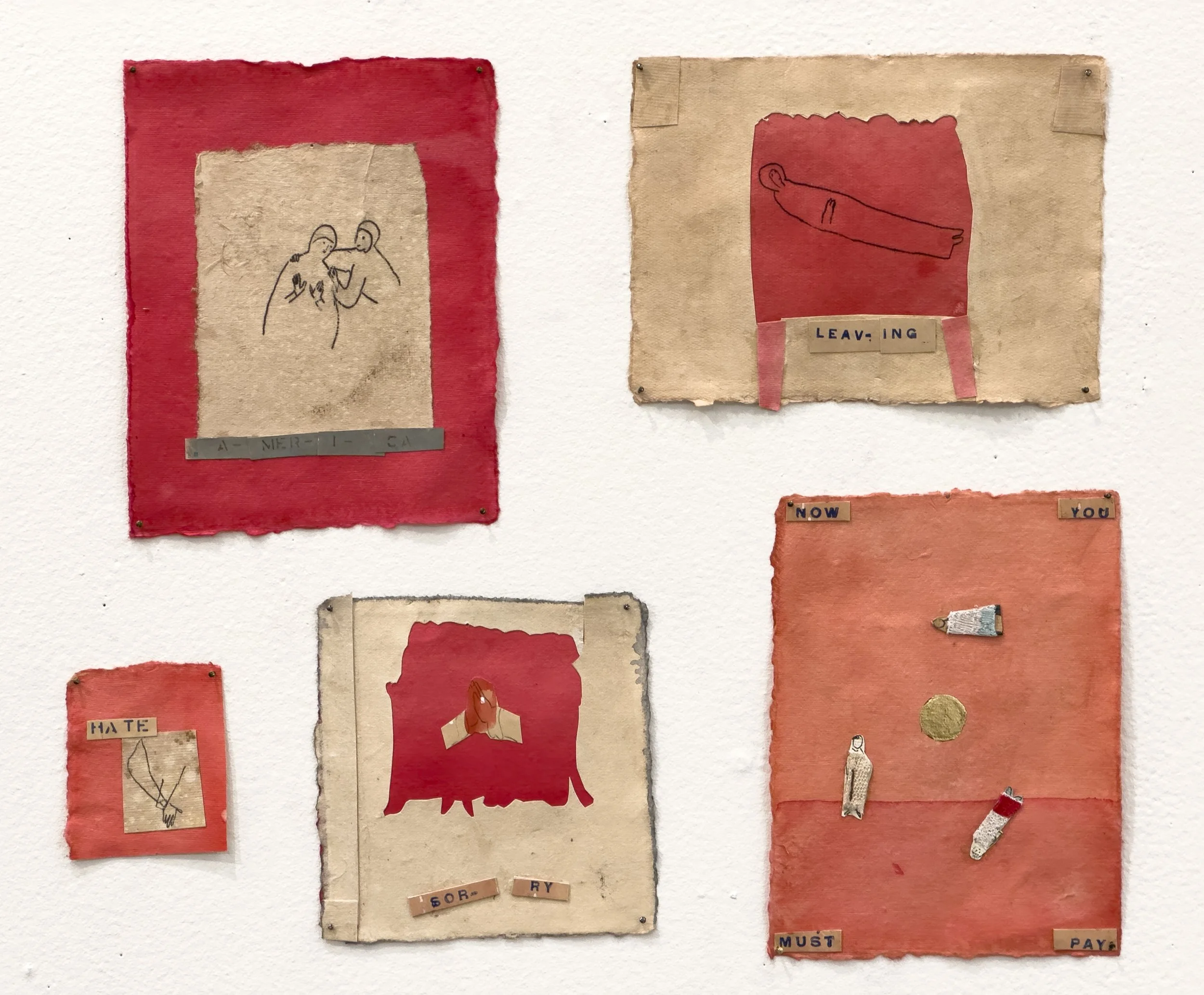 Ink, gouache, graphite and fabric on tea-stained watercolor paper